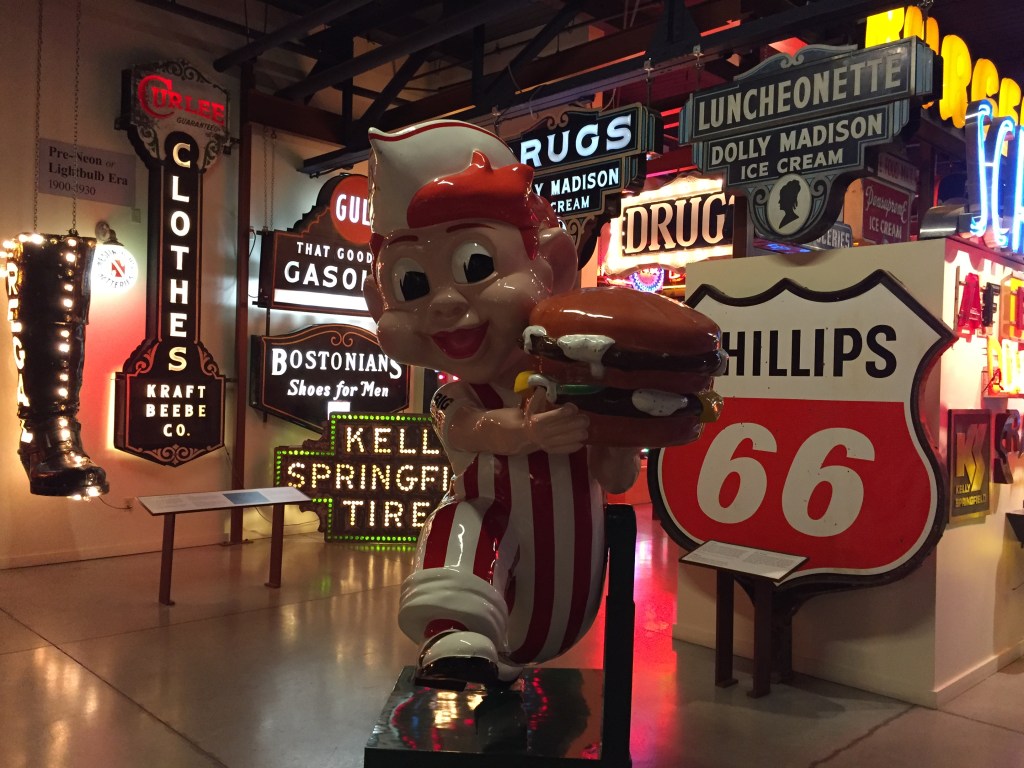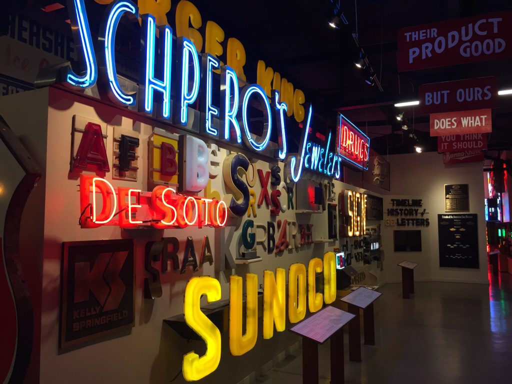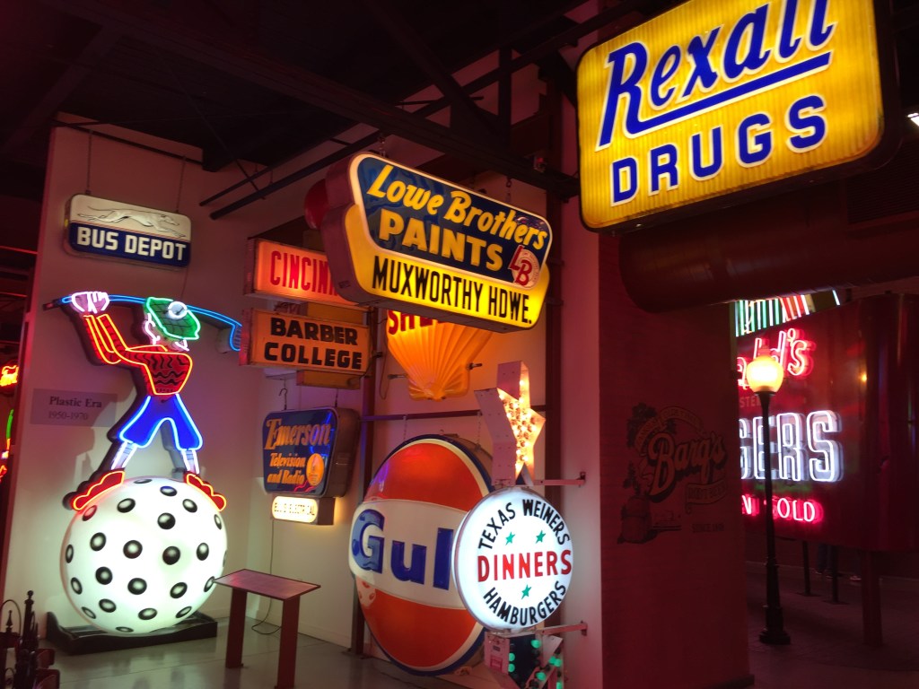 During the holidays I visited relatives in Cincinnati and having some downtime I visited an attraction there for the first time. The American Sign Museum is a pretty cool place if rather small and crowded. They have collected and restored old signage with lots of nostalgic appeal (even a set of Burma Shave signs). Lots of neon and lots of recognizable brand names, some that have faded from the landscapes and others that have evolved over the years.
