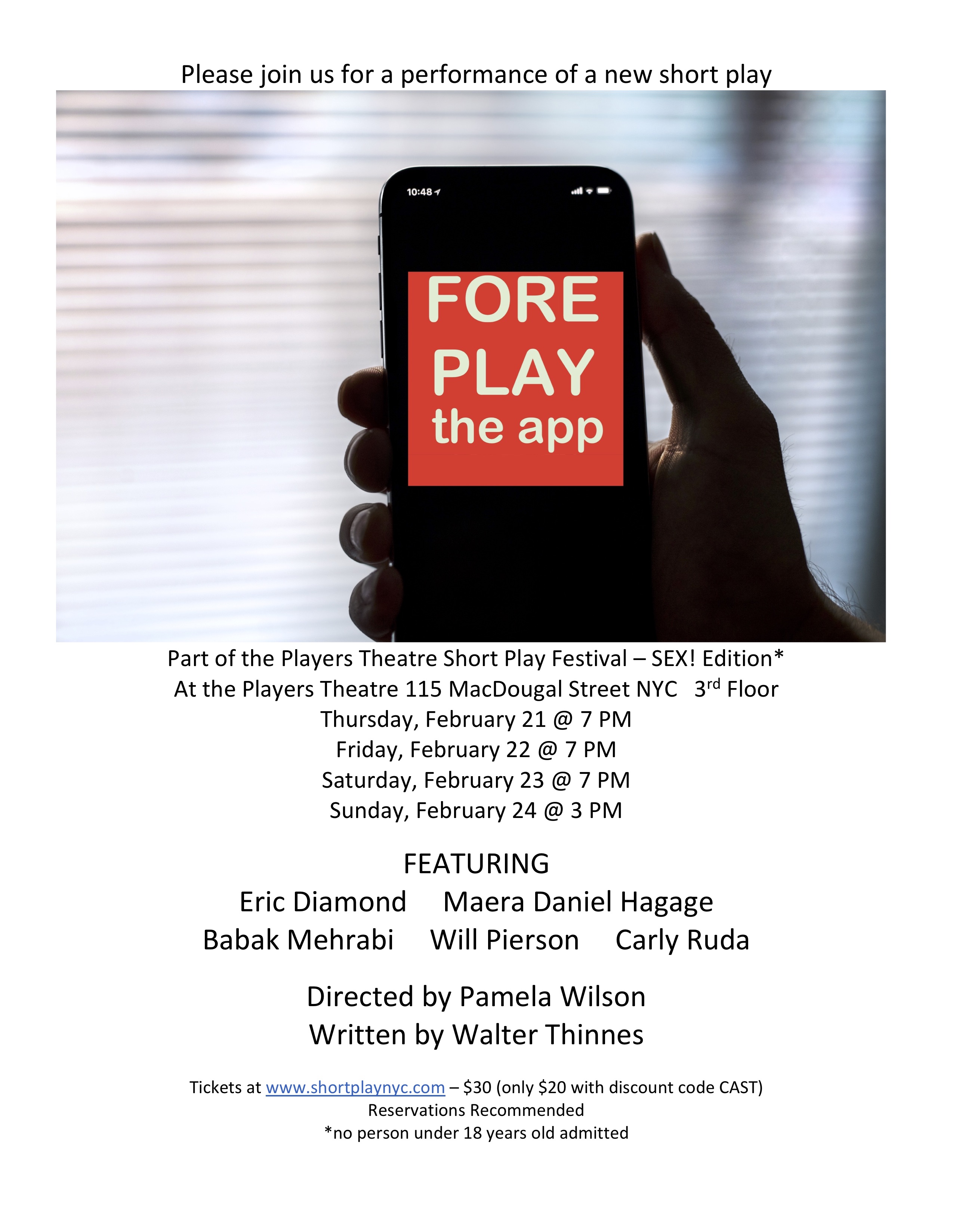 Coming up later this month my new short play will be in the Players Theatre Short Play Festival in Greenwich Village. It is not profound but is a fun playful piece. The performers, Eric Diamond, Maera Daniel Hagage, Babak Mehrabi, Will Pierson, and Carly Ruda have been terrific in early rehearsals. We strongly recommend you make reservations and let us know the night you are coming. We look forward to seeing you there.