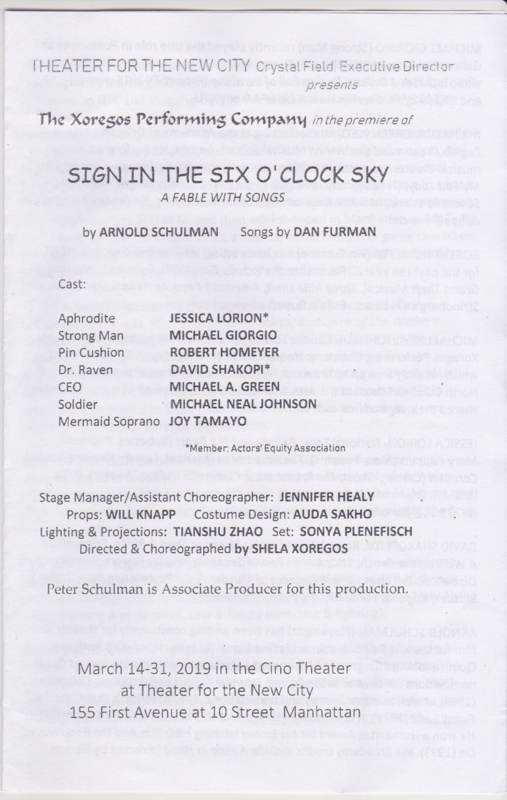 Theater For The New City is a home for experimental and ambitious theater. It is fitting that Arnold Schulman’s “Sign in the Six O’Clock Sky; A Fable With Songs” is currently playing there. The new play is aspirational, captivating but ultimately flawed. It is as if the author stood before a restaurant chef’s cooktop with many delicious stews and pots on the range, then took a scoop from lots of the vessels and put them all in a large bowl before the audience. While each recipe may be delicious, by putting so many disparate scoops in one bowl, the flavor is muddled and discordant.