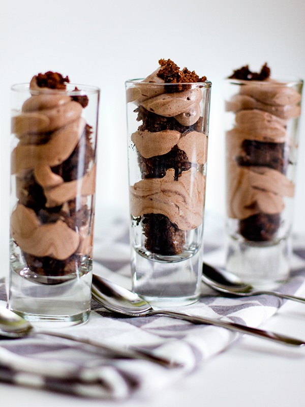 Start with brownies (your favorite recipe, from a box or even commercially made). Crumble them into chunks that fit in your shot glasses. In a medium sized bowl beat the ingredients from a box of instant chocolate pudding mix with 1 1/2 cups milk with an electric mixer until you reach pudding consistency. Again use your electric mixer to beat 1 cup heavy whipping cream until soft peaks form and then fold the whipped cream into the chocolate pudding mixture to make a faux mousse. Alternate placing brownie crumbles and piping the mousse in layers into tall shot glasses or champagne flutes or similar vessels. Serve immediately or cover with plastic wrap if refrigerating for a day or two to keep unwanted flavors from migrating into the dessert. And you will need small spoons!