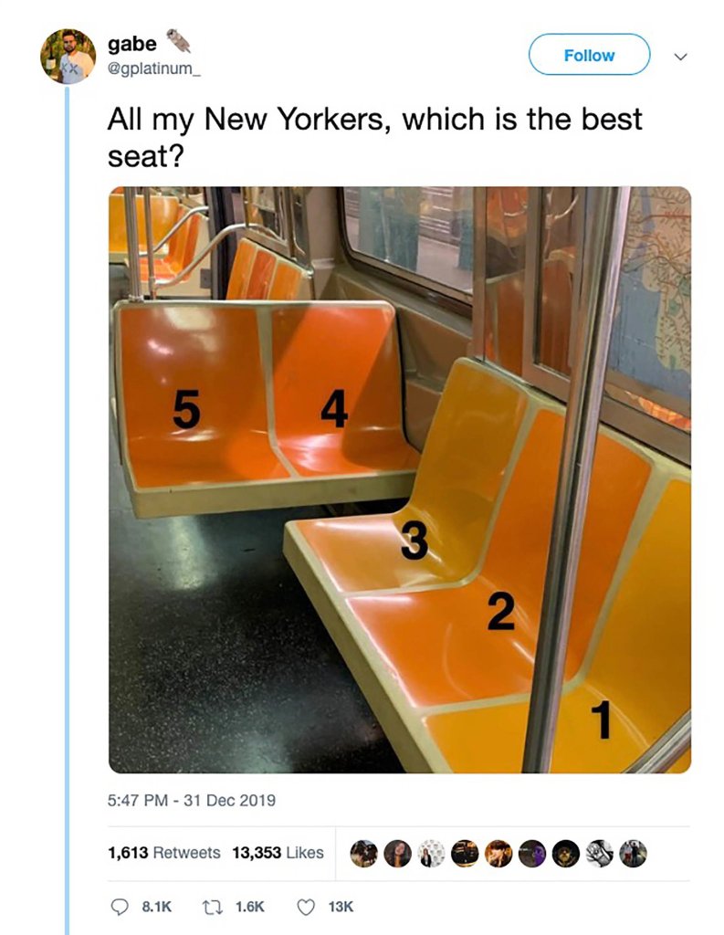 Well, the leader of the subway system, the great Andy Byford, did say that he seldom sat as the seats are for customers. Way to go Andy and please keep improving our subway. By the way, if you do ever sit, #1 is the obvious answer. Anyone want to disagree?