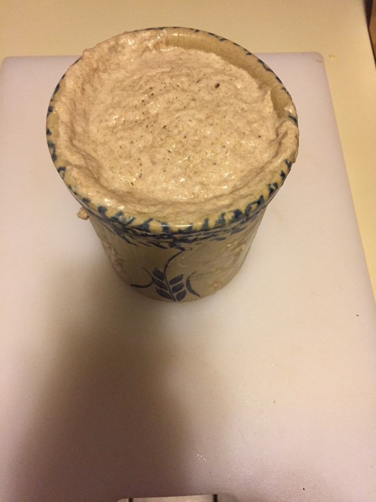 Before going to bed I filled less than half the crock with the flour and water. The next morning it was overflowing, that is how active the mixture was (see the photo below). I am still cultivating the starter and will perhaps soon start baking things again. Good to have it back.
