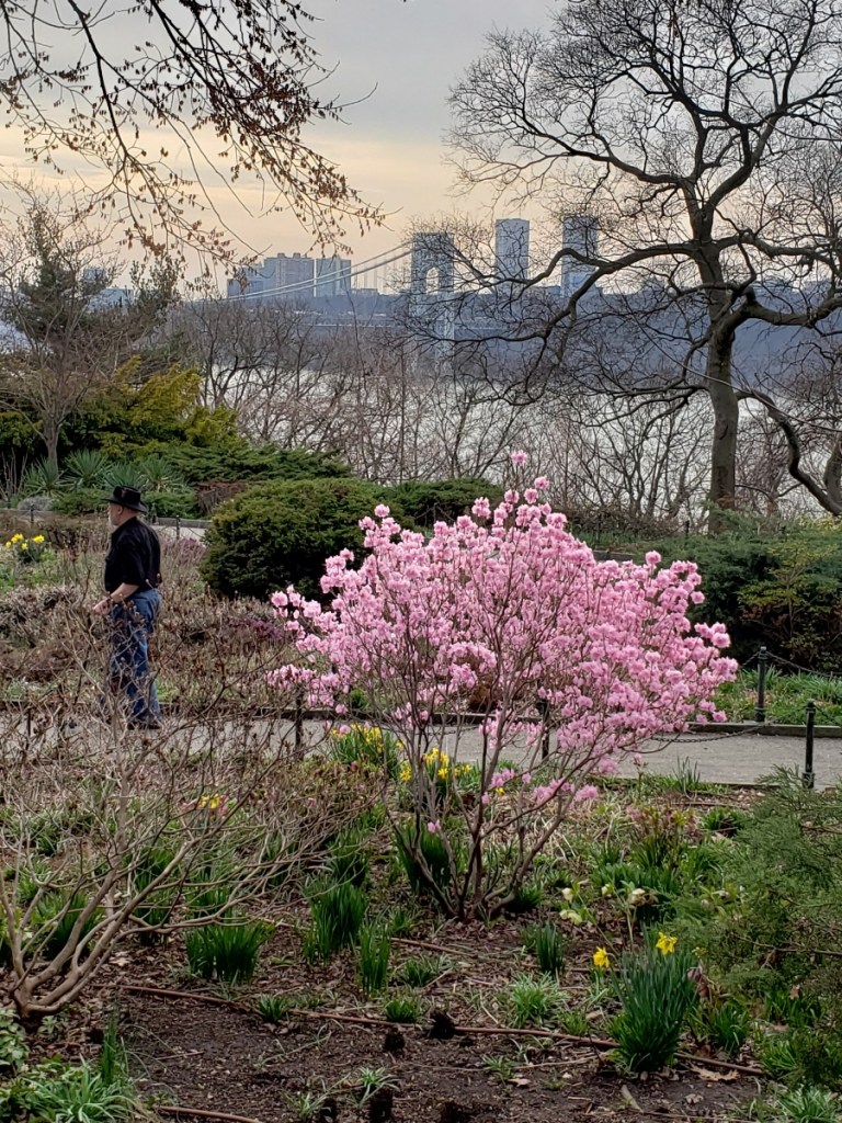 The Spring Equinox happened last night at ten till midnight. That means that this morning, Friday, March 20, 2020, is the first sunrise of the spring (in the Northern Hemisphere) as this post is published. We need a new season and we need to get outside even as we shelter in place. Keep your social distancing from other humans but enjoy the blooming flowers. Pamela and I took a lovely stroll through nearby Fort Tryon Park recently here in New York. It was lovely and glorious and she took some nice photos. Look closely and you may catch your intrepid blogger ambling along the path. Enjoy spring, wherever you may be.