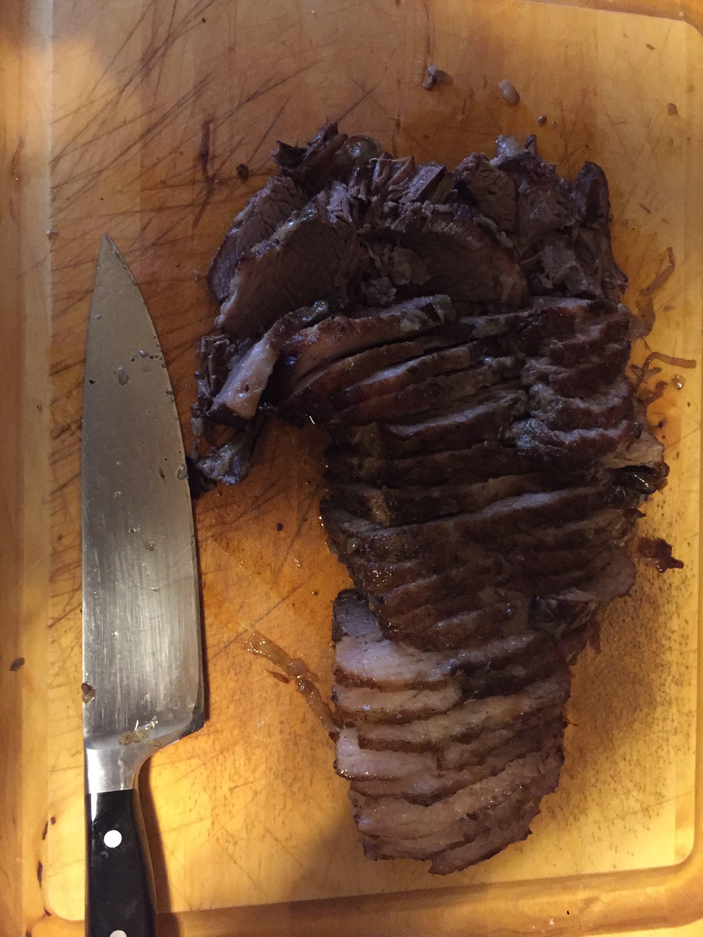 Recently Pamela came back from shopping with some of the few meat products available and one was a brisket. It was more than 7 pounds and I immediately knew I wanted to split it in two and make it two different ways. Please pardon the poor photographs because I was so eager to dig in that I didn’t take any time to get them right. First I wanted to braise the first half, using this recipe.