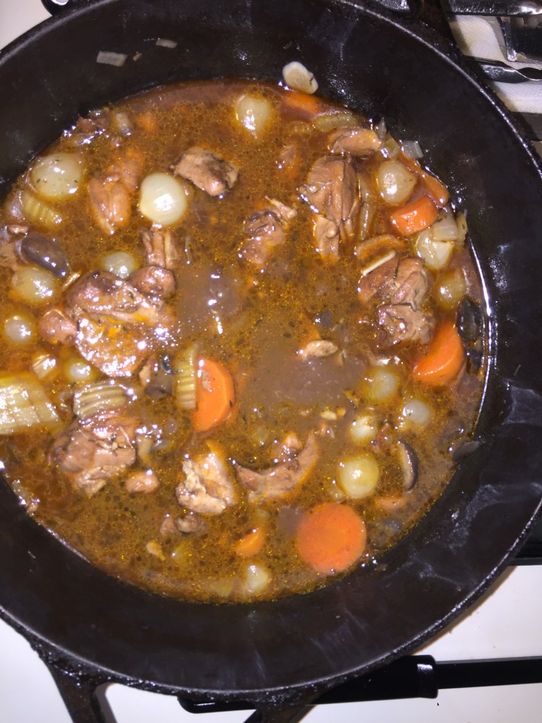 Now it was time to saute vegetables, starting with minced onions, celery and sliced carrots. After about five minutes I added the mushrooms and pearl onions. Added in some thinly sliced garlic and cooked for another minute or so. Then a glob of butter and small handful of flour to create a thickening roux. Then a bit of thyme and in comes the wine and a couple of glugs of brandy as well as some of my homemade chicken broth. After stirring to thicken back goes the bacon and chicken. Reduced to a simmer and pop on the lid for and hour or so.