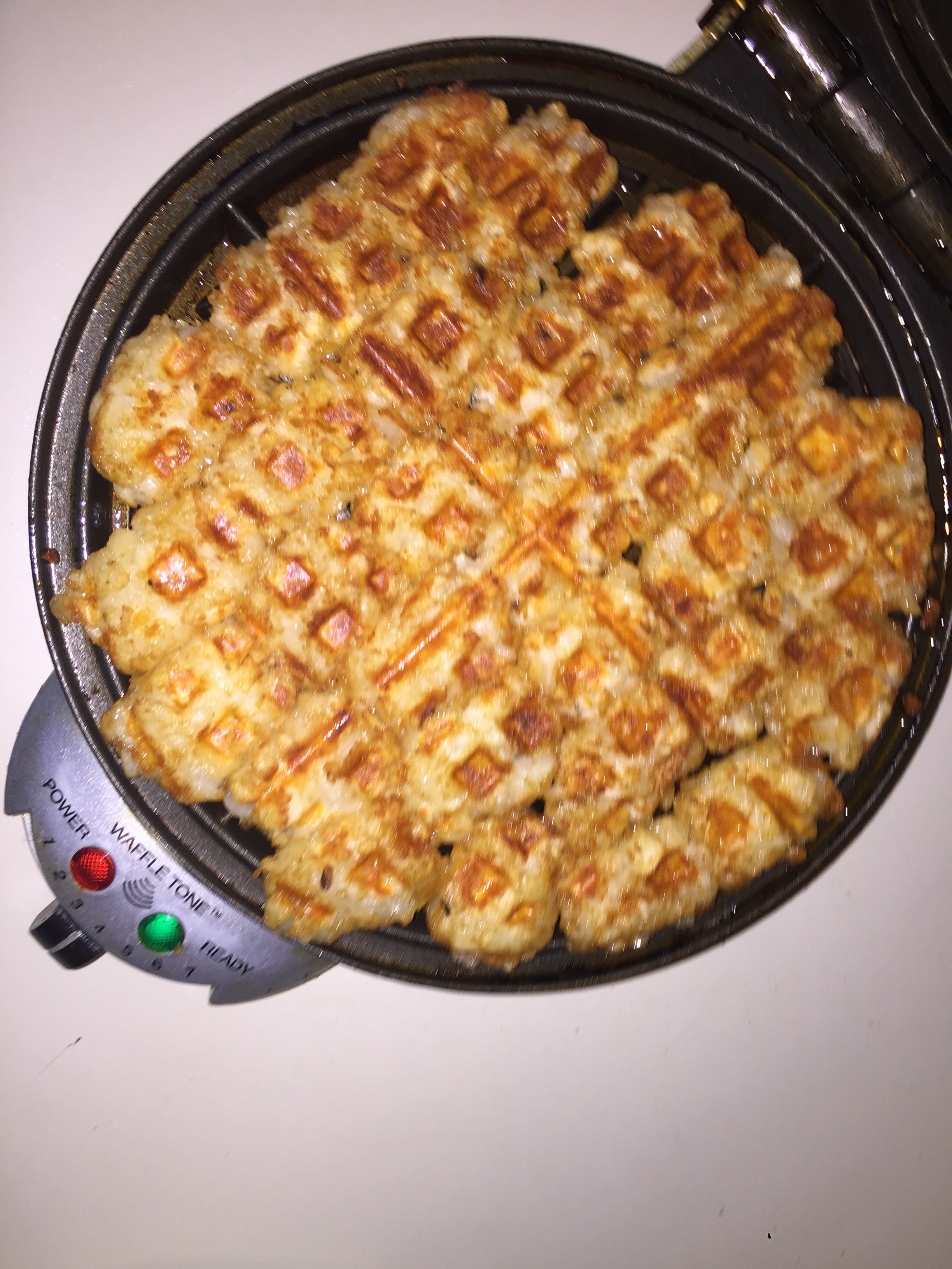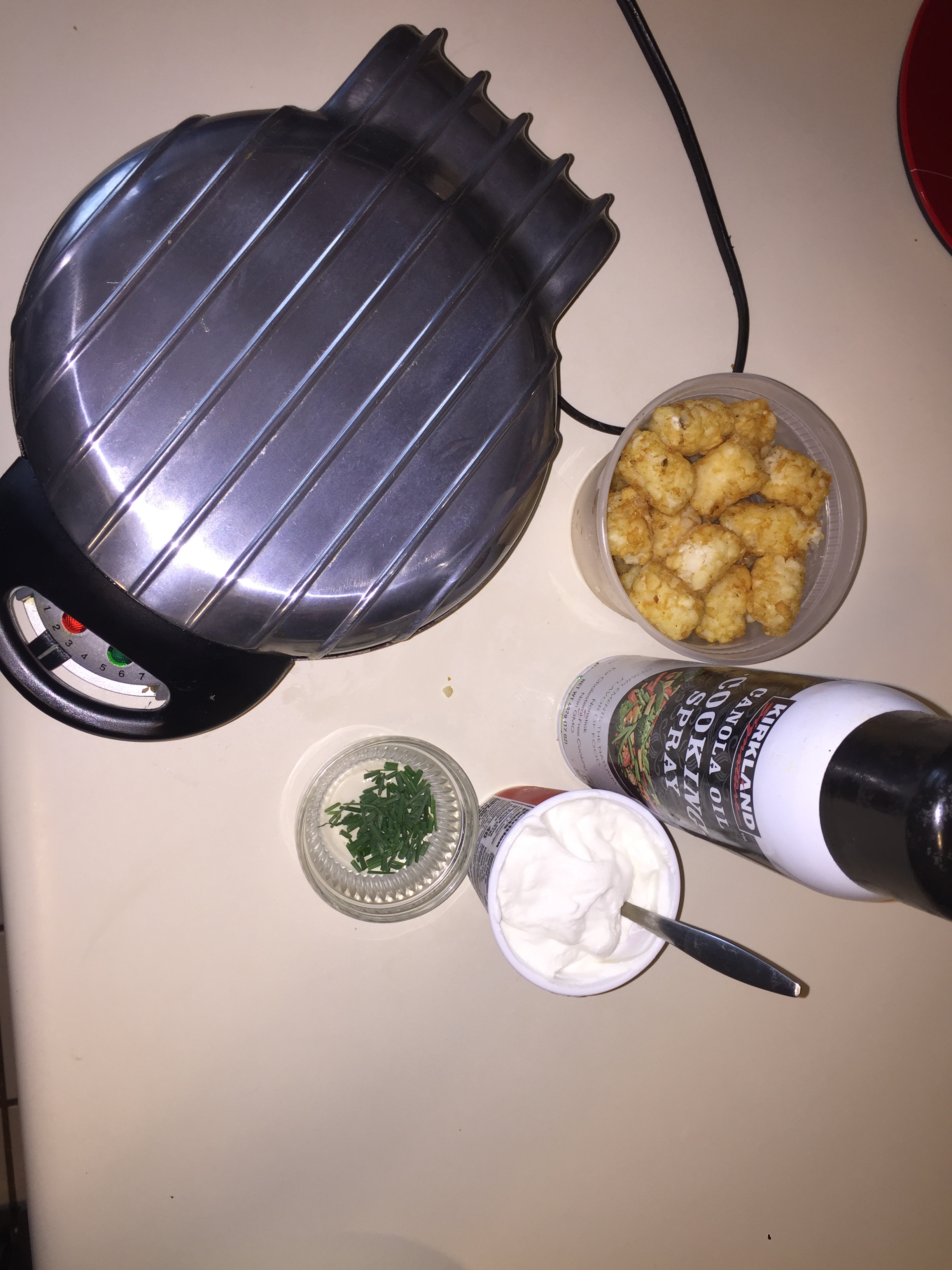 Really simple. You spray some cooking oil on the grid, line up with room temperature tots, close the lid and cook until crisp. I adorned with some sour cream and chives. This lazy latke was terrific and a nice use of my Villaware Waffle Iron and I will certainly make this again! Give it a try!