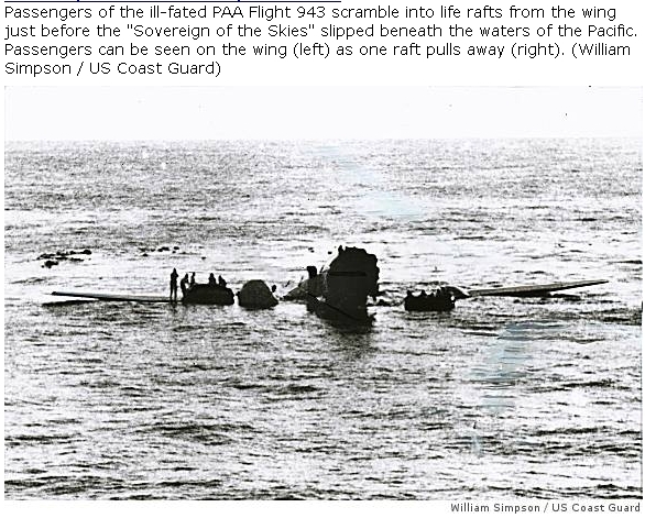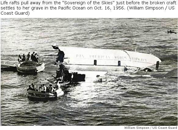 On October 16, 1956 there was an astounding water landing in the Pacific Ocean that made headlines because it was the first forced water ditching where all crew and passengers survived. It was Pan Am Flight 6 (sometimes erroneously called flight Flight 943), an around the world flight on a leg between Honolulu and San Francisco.