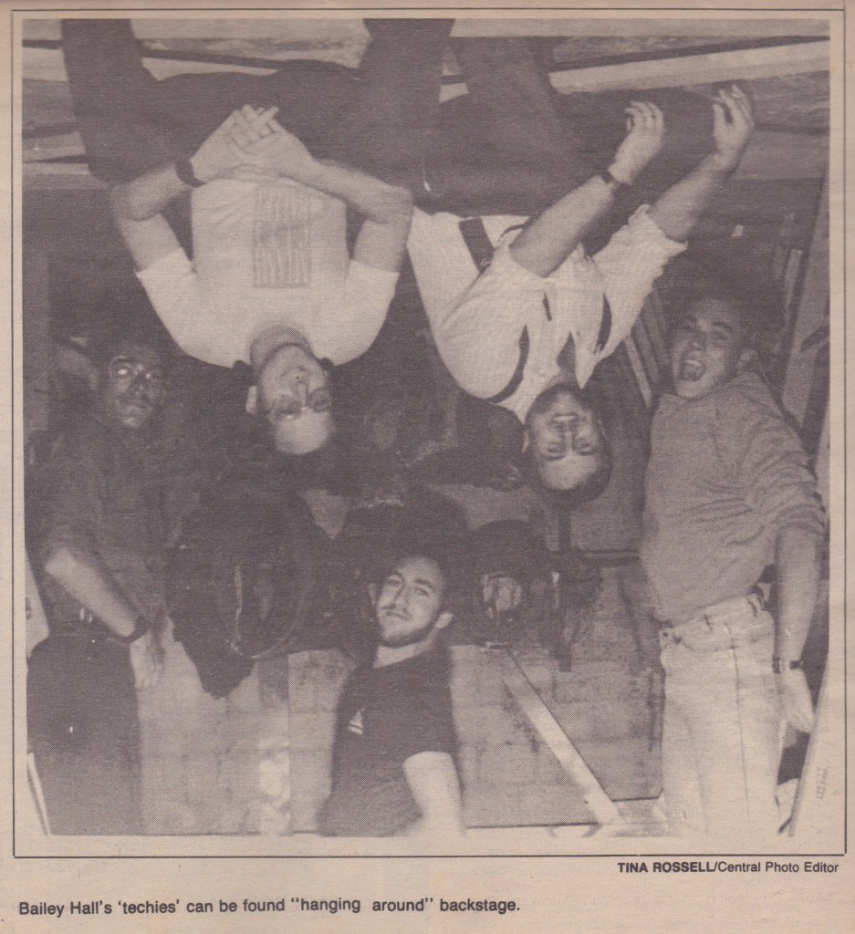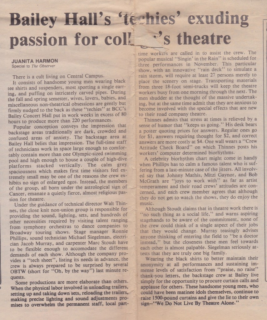 As noted earlier, I finally came a cross a treasure trove of old stuff, so you can be bored by my memories. Watch out, Thursdays will never be the same. On October 12, 1987 I was the Technical Director of Bailey Concert Hall, a road house on the campus of Broward Community College in Fort Lauderdale, Florida. The college paper, The Observer, did a big cultural events section and featured our terrific house crew at the theatre. Much yellowed and tattered, here is the picture that went with the article…