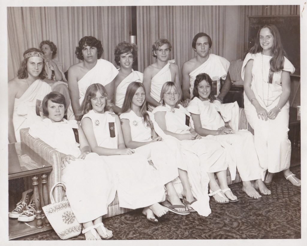 In high school I was required to take a language course. I honestly wasn’t interested in learning another language, heck, I can barely speak English. But then I learned if I selected Latin I would have to also study Roman and Greek history. That sold me. I love history, always have. And all these years later I cannot speak Latin at all, but I learned good ancient history. Still love it. So I recently discovered an old photo of the Latin class from my Florida high school. We had a grand feast that recreated what we knew then of a Roman meal (not the garum – the fermented fish sauce that was common with Roman meals). It was fun and we all wore togas made out of bedsheets. Very authentic. It was the 1970’s and I was (and think I still am) very much a hippie. You can pick me out pretty easily on the second row far left. Peace out, man. Or as we say in Latin: et pax, hominibus.
