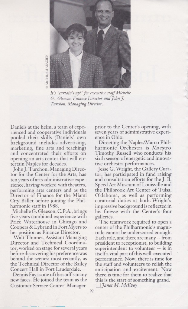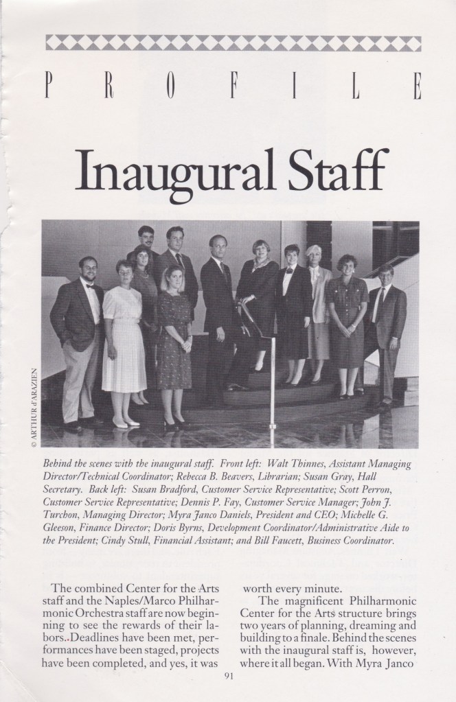 Following up on the celebration of the anniversary of The Philharmonic Center for the Arts in Naples, Florida. The building is amazing and the community is great. But the best part of my years at The Phil was my colleagues there. The staff was talented, inventive and fun. I kept a copy of the opening playbill as a souvenir. One feature was a quick article about the opening staff so I have included a copy here. It is thirty plus years old and a bit dated, but very fun memories.
