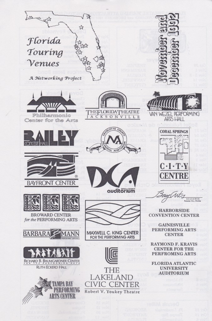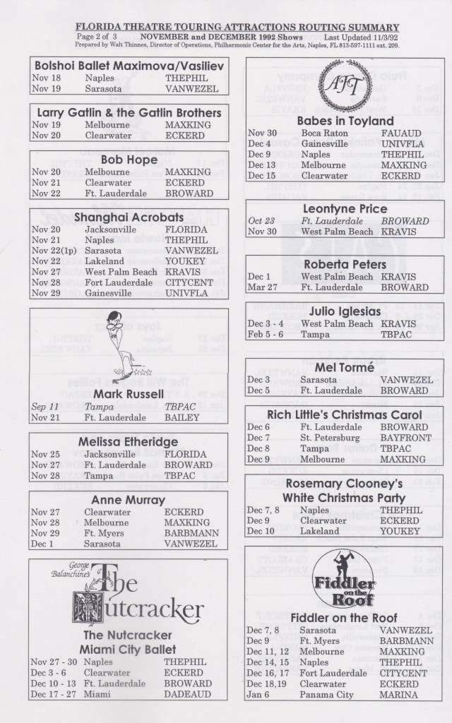 So you can see that at the end of 1992 Bob Hope had three dates in Florida. Not at The Phil, but of course I included it to help Melbourne, Clearwater and Ft. Lauderdale where he was performing. There was also a tour of the musical Fiddler on the Roof that played four stages before The Phil and three after. We could get advanced information before they landed at our loading dock and could pre-warn those venues following us. By fax or phone of course.