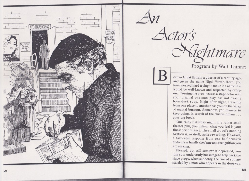 Yes, I know. There is a play by Christopher Durang called The Actor’s Nightmare but this is not based on that play, though I was very aware of it (funny play). Instead my hero is an actor with a great opportunity. He is selected to star in a great new script which could make his career. The night before his understudy slips him a mickey, steals his clothes and ID and locks him in his hotel room. You are required to break out of the hotel, make your way across town to the theatre, avoid the public entrance where the show has sold out, slip in the stage door, avoid the guard, get your ID from the dressing room and the extra costume from the costume shop, make your way through backstage while avoiding the evil stage manager who is in on the plot and burst onto the stage to take your place in theatre history. So much can go wrong on the way the player often must start again until the user succeeds. So if you find the Third Rainbow Book of Adventures (published January, 1987) you can find the entire program typed there for yourself. For being selected and inclusion in the book I received, you guessed it, a free copy of the book!