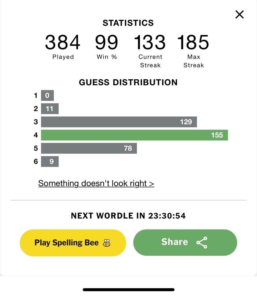 I like many puzzles, primarily word based puzzles like the New York Times Crossword Puzzle and Spelling Bee games. As I’ve mentioned before, my favorite word puzzle is the game Wordle. Each day a five letter word is issued and you have six chances to guess that word. There are various rules and I choose to play the “hard” version meaning that once you establish a letter is part of the solution, you must use it in your next word guess. Scores are kept and accumulated and here is a summary of mine to date: