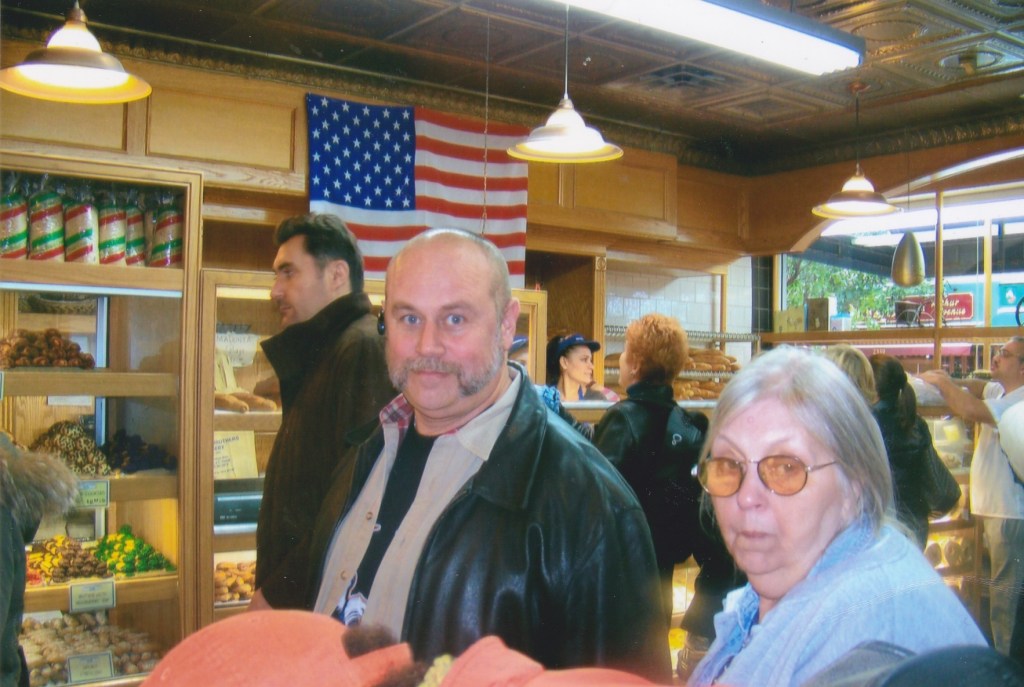 Here is a photo of us at Madonia Brothers, a fabulous Italian bakery with great traditional cookies and fresh loaves of specialty breads. My favorite attraction is their Cannolis. They only stuff the shells when you order it so that the ricotta filling does not soften the freshly baked shells. Delicious. (Pardon my face, I was trying out “friendly lamb chops” where my sideburns meet at my mustache, skipping my chin. Pretty silly but I enjoy changing up my beard from time to time.)