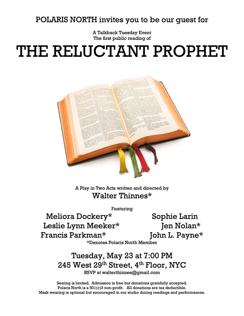 The title says it all. This evening at the Polaris North Studio we will have the first public reading of my newest full length play THE RELUCTANT PROPHET at their very first Talkback Tuesday event so I will get feedback from the audience. I can’t wait. If you are in The Big Apple I hope you can join us. More news about it soon.
