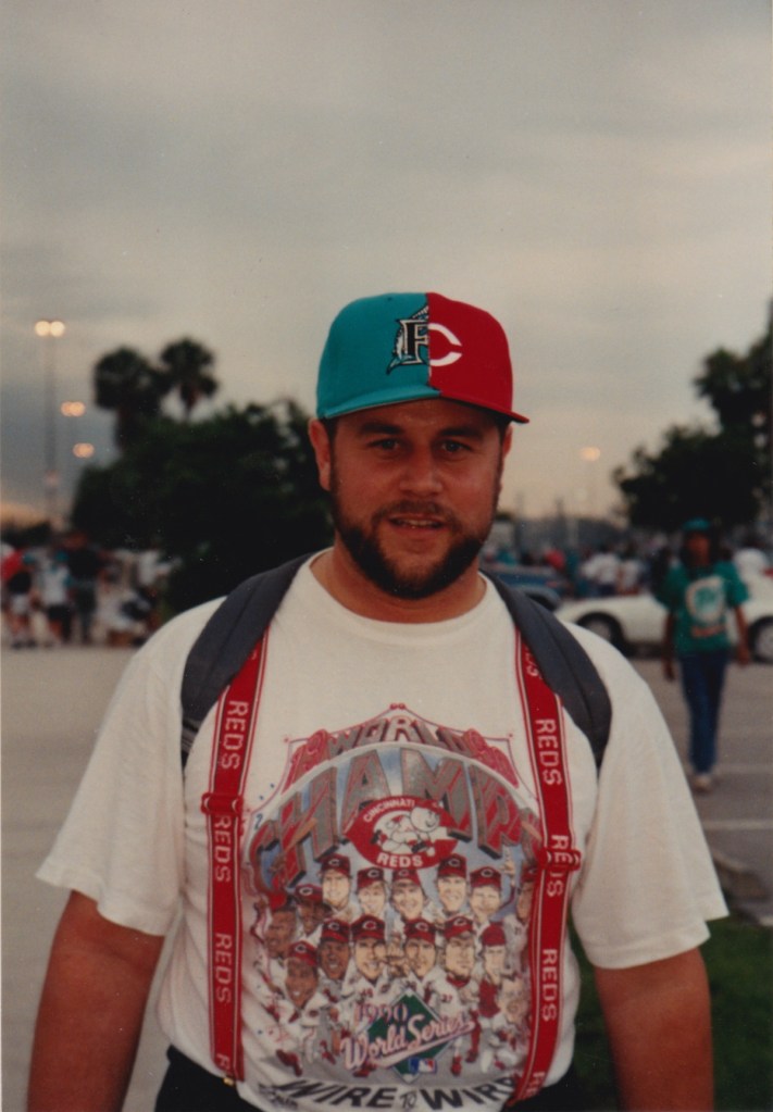 It did get me thinking back to the 90’s when the Miami Marlins were founded as an expansion team while I was living in southwest Florida. They were the new local team but I could not stop rooting for my Reds. So I took a Reds hat and Marlins hat, sliced them in half and sewed back the odd pair to show some “divided” loyalties and attended a game. But note that my T-Shirt and suspenders gave away my true fandom…