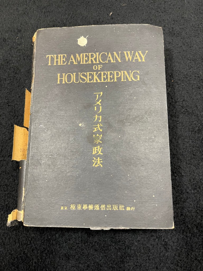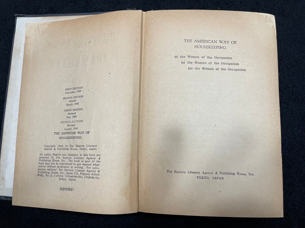 This battered and well worn volume runs to nearly 500 pages with illustrations and explanations. It is blatantly a manual to educate conquered Japanese women how to please their newly occupying American husbands. It was a different time and ethos and quite illuminating of the American WASP of the day. Observe the dedication page.