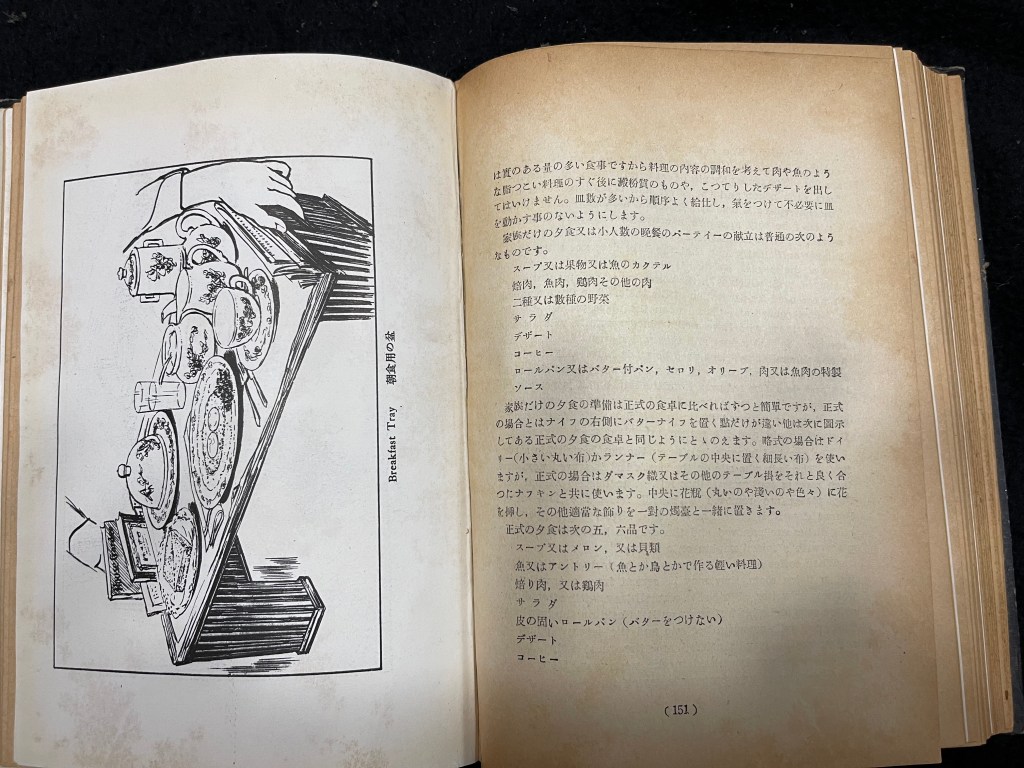 As you can see, it has a copyright of 1948, though this volume is in the fourth printing in 1950. Yes, our occupation went on a long time, obviously torturous to the vanquished population. It was printed and issued in Tokyo and is dedicated “of the Women of the Occupation; by the Women of the Occupation; for the Women of the Occupation.” How utterly civilized. Throughout the book there is an English text and a Japanese translation, so both parties to the interaction knew just what was expected. It covers a wide range of housekeeping topics.