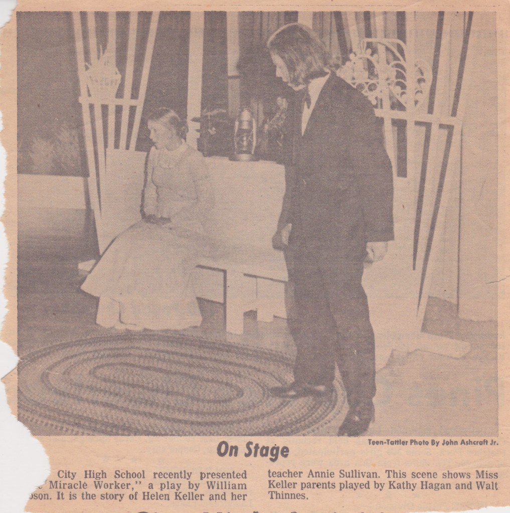 For no particular reason I am resurrecting a memory from very long ago, way back in my high school days. It was there I contracted the Theater Bug which infests me to this very day. From acting to theater management to playwriting, it consumes me still. Back in Cooper City High School in Florida, circa 1975, I was fortunate to be cast as a lead role in the play “The Miracle Worker.” It was the biggest challenge up to that time and it was a wonderful experience. The local newspaper did a story on it and included a picture with me and another cast member that I dutifully clipped out and saved to this day.