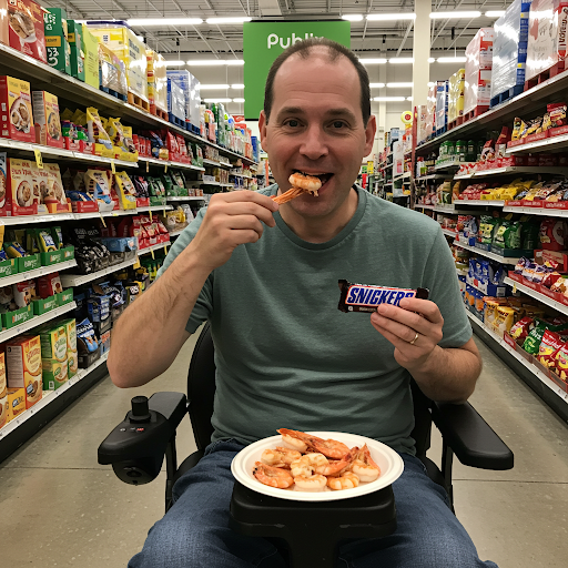A Publix grocery store in the Villages (not far from where I live) called police when they spotted a man riding a motorized chair while eating fresh shrimp in the store and trying to dispose of the packaging. Upon investigation they discovered that he had also disposed of empty sushi containers and a Snickers bar wrapper. Obviously a seafood fan, but I question his choice of desserts with so many good options at a Publix market. He was charged with stealing $45 worth of merchandise and arrested on a $7500 bail. While you can get a real news report about it here…