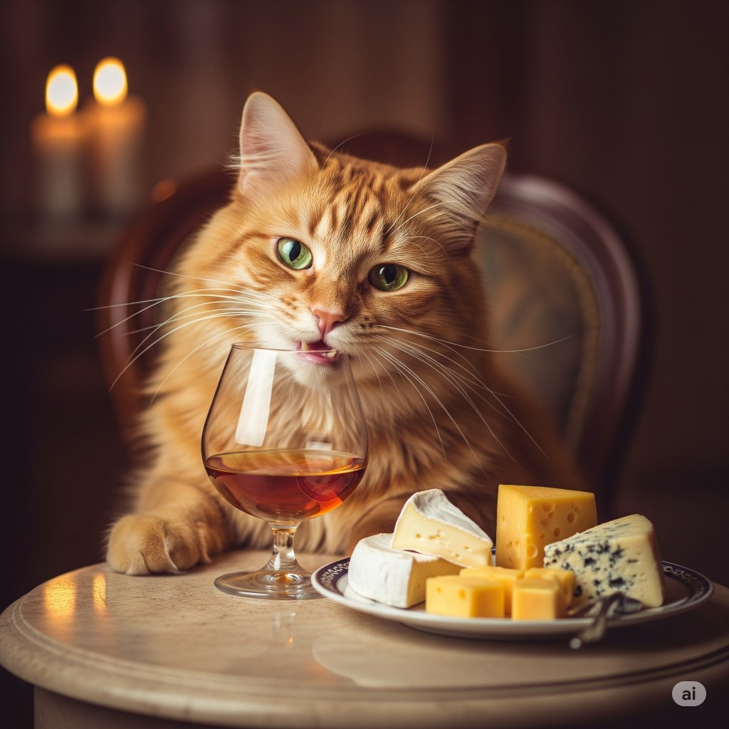 Pretty straightforward but I hear some of my readers worry if that poor kitty should be imbibing that much cheese and drinking cognac at all. Relax. The cat is not real, even though it looks convincing. Would it help if I requested the A.I. generator to make it a cartoon?