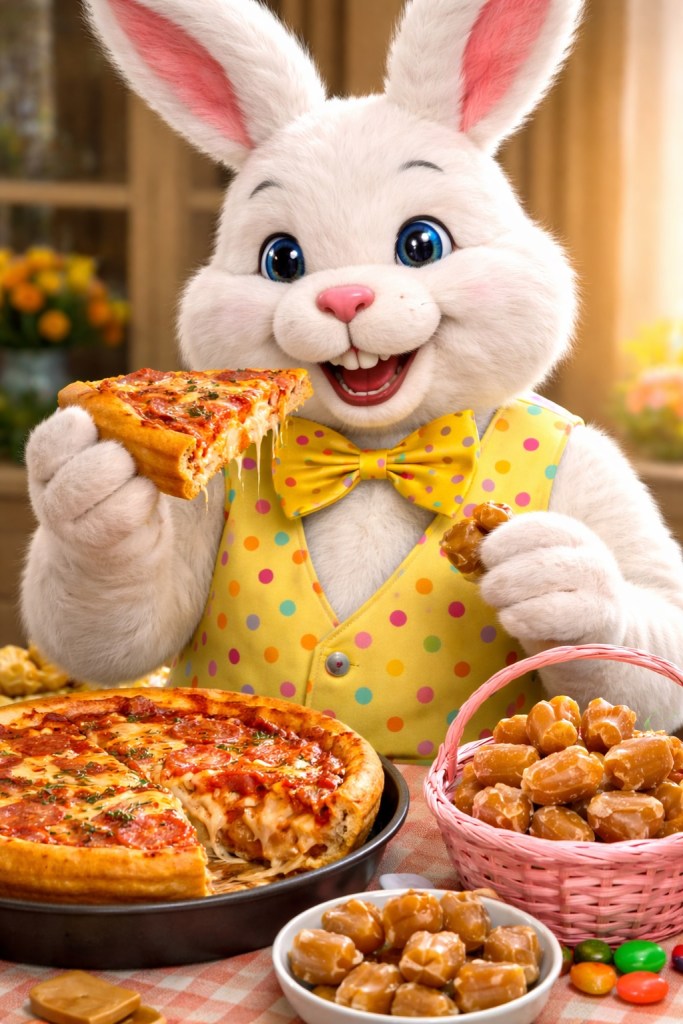Easter, of course, flits from date to date based on lunar traditions over the years. This makes it a prime candidate for changing connections to various National Days, from which I ask an artificial intelligence image generator to create silly mash-up activities for the Easter Bunny to partake in. This year I asked the free version of ChatGPT to celebrate Easter, National Deep Dish Pizza Day and National Caramel Day and got this silly mash-up…
