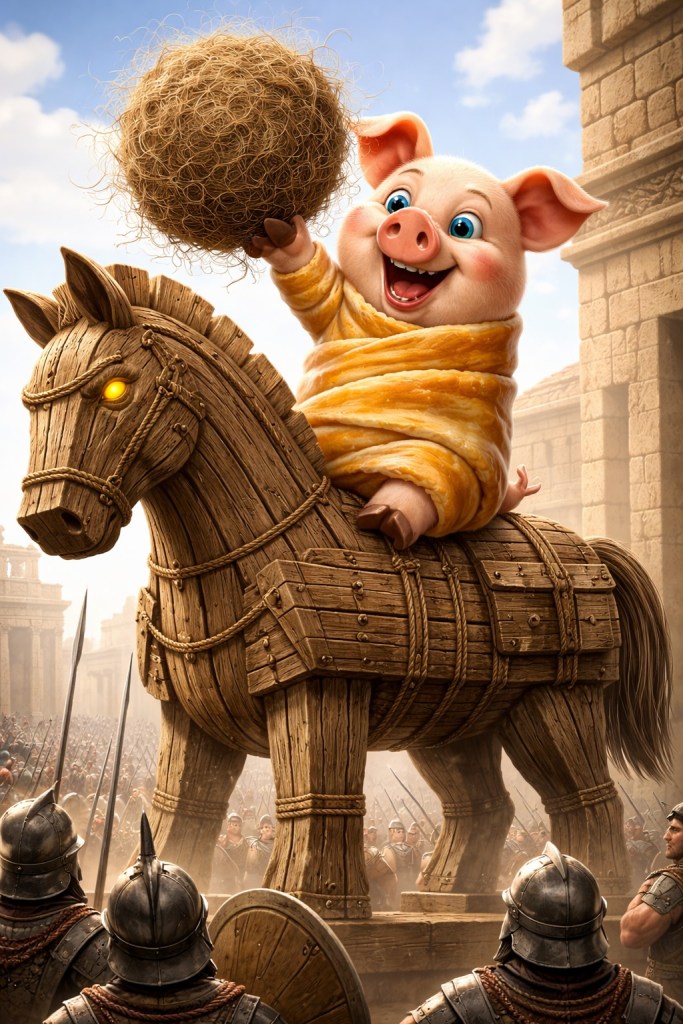 Artificial Intelligence is a real world concern, for your job, for your privacy, for your sanity. But for me, it is a playground. I have used several different free AI programs to create images for various purposes. My biggest project is to combine several National Days to create one weird image that is often a bit crazy. All for a quick laugh. Recently I asked ChatGPT to combine National Pigs in a Blanket Day (you know those mini wieners in puff pastry) with the traditional date for the delivery of the wooden horse to the city of Troy (beware of Greeks delivering gifts) with the National Hairball Awareness Day (enough said about that). And this is what came out…..